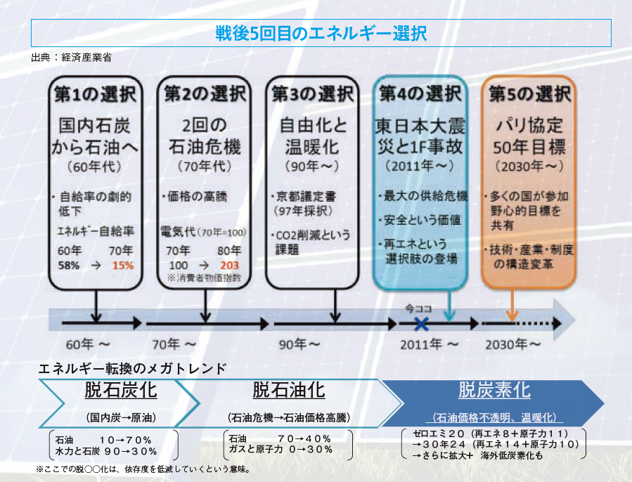 エネルギー情勢懇談会の提言によると、いま日本は、「戦後5回目のエネルギー選択を構想すべき局面にある」(下表参照)。