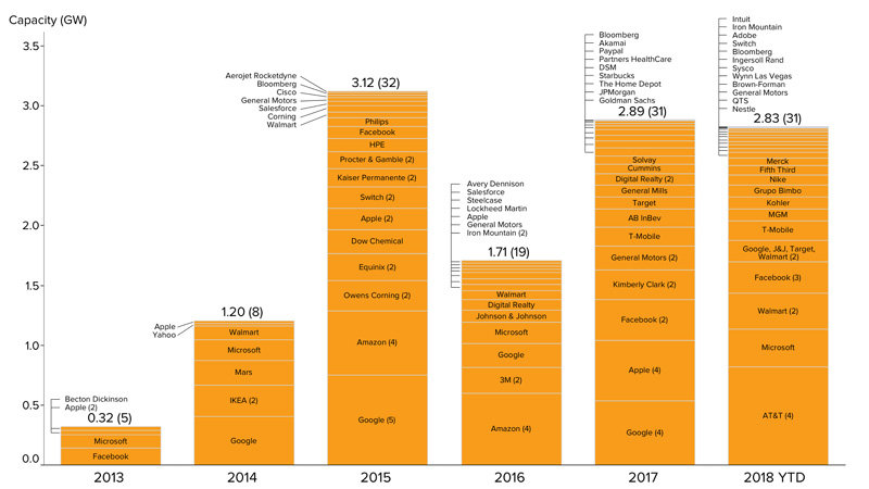 グーグル、アップル、フェイスブックの3社を合わせると半分以上の1.5GWを占める。2018年は7月10日時点で、既に2.83GW分の再エネが調達契約済みであり、マイクロソフトの315MWの太陽光発電調達が含まれている。