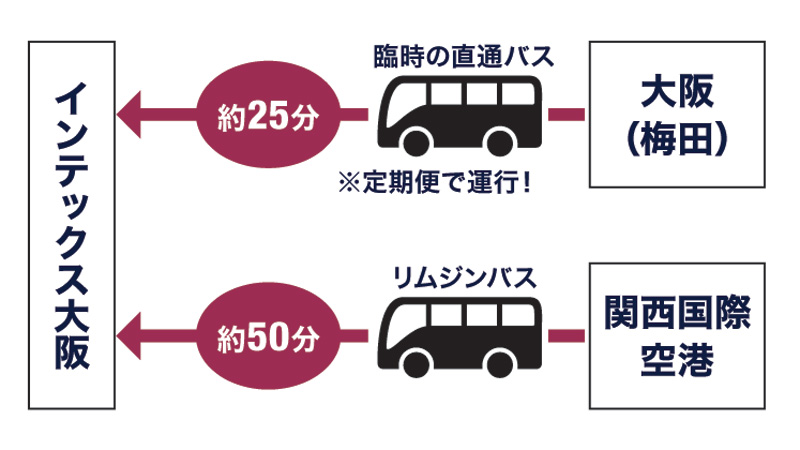 ●アクセスは「バス」がオススメ! 大阪駅からは、会場直行の臨時バスが運行される。