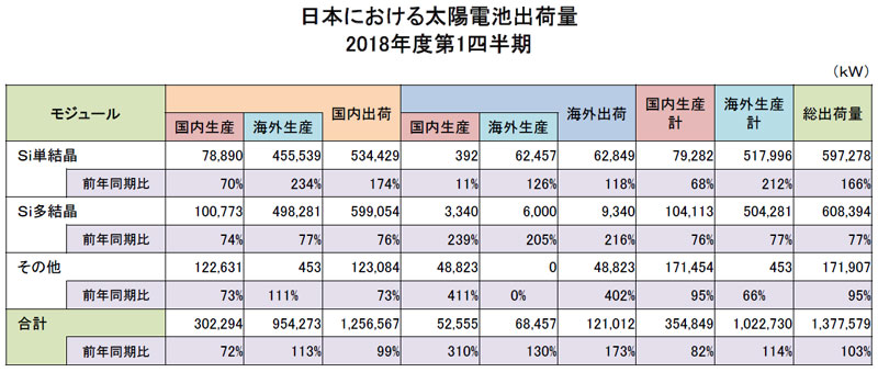 太陽光発電協会(JPEA)が、国内の2018年度第1四半期の太陽電池出荷量を発表。太陽電池モジュールの総出荷量は1,378MWで前年同期比103%となり、実に13四半期ぶりにプラスに転じた。