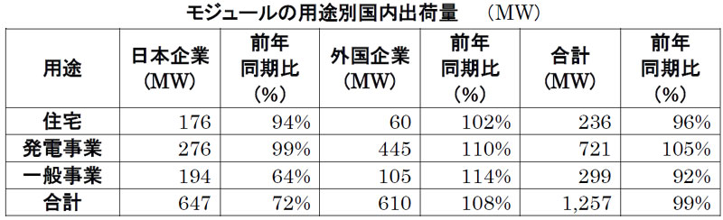 モジュールの国内出荷量は、1,257MWで前年同期比99%と、ほぼ横ばい。これまでは3四半期連続で前年同期比2ケタ減が続いていただけに、ようやく下げ止まったといえる。海外出荷量は121MWで、前年同期比173%と大幅に増加した。
