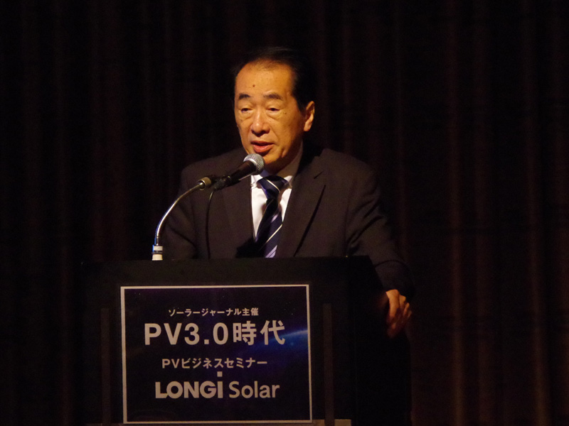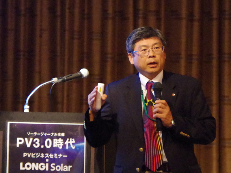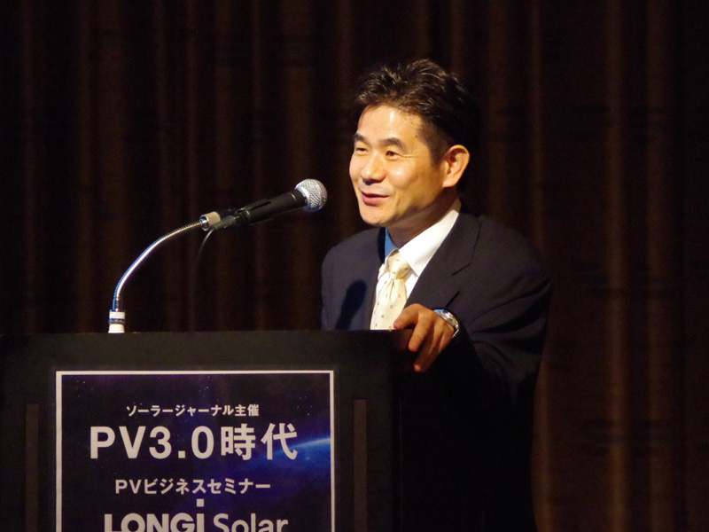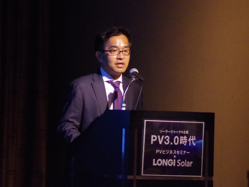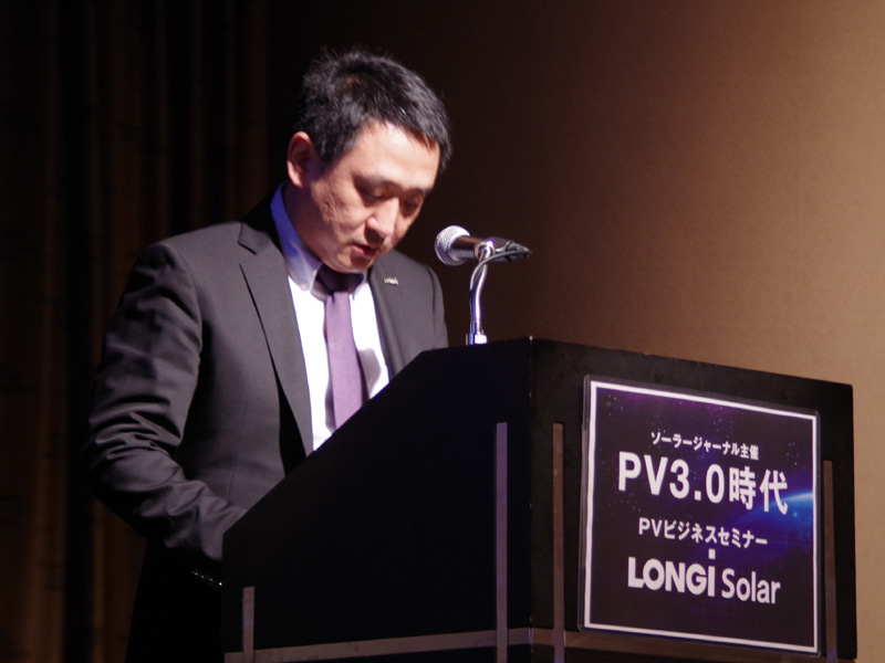 特別協賛のLONGi Solar Technology・王氏によるウェルカムスピーチ。本セミナーの主旨や概要が説明された。