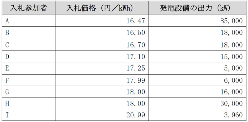 入札に至った9社中、最も入札価格が低かったのは16.47円/kWh。上限額の15.5円とは、1円近くの開きがある。