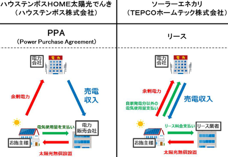 一方のTEPCOホームテックのサービスは、「ソーラーエネカリ」というリース型だ。施主とTEPCOソーラーテックがリース契約を結び、初期費用なしで太陽光発電を設置。施主はリース料金を支払うが、売電収入を得ることができる。こちらも、10年のリース契約期間が満了すると、太陽光発電設備は施主へと無償譲渡される。