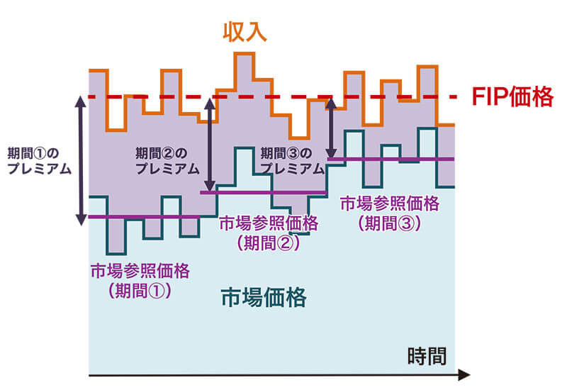 プレミアム:FIP制度において発電事業者が受領するプレミアム収入(基準価格と参照価格の差。一定期間内は固定。長期的には変動)